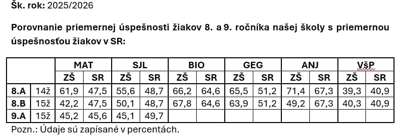 Výsledky ôsmeho ročníka v matematike, slovenskom jazyku a geografii navyše zaradili našu školu medzi 25 % najúspešnejších škôl na Slovensku, čo je veľmi povzbudzujúci signál.